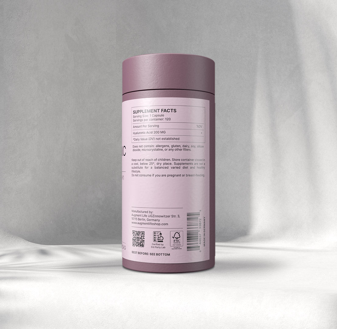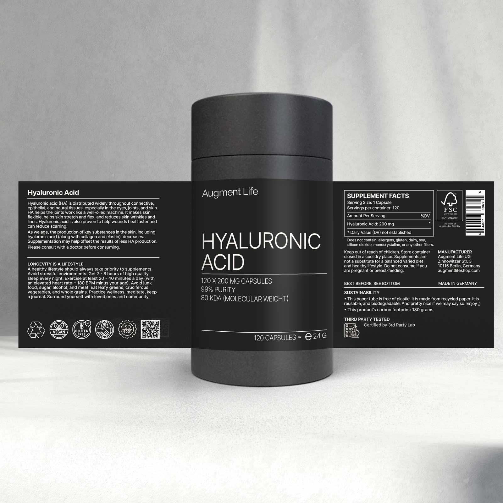 • Contents: Hyaluronic Acid, 200 mg/500 mg per capsule, 80 kDa (molecular weight)