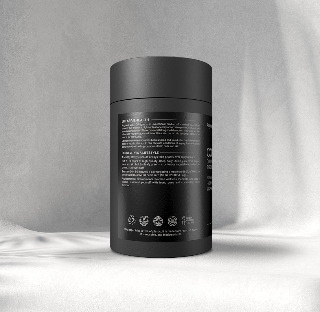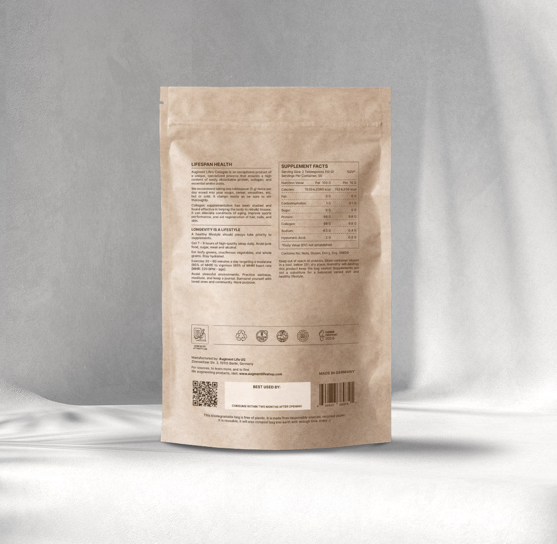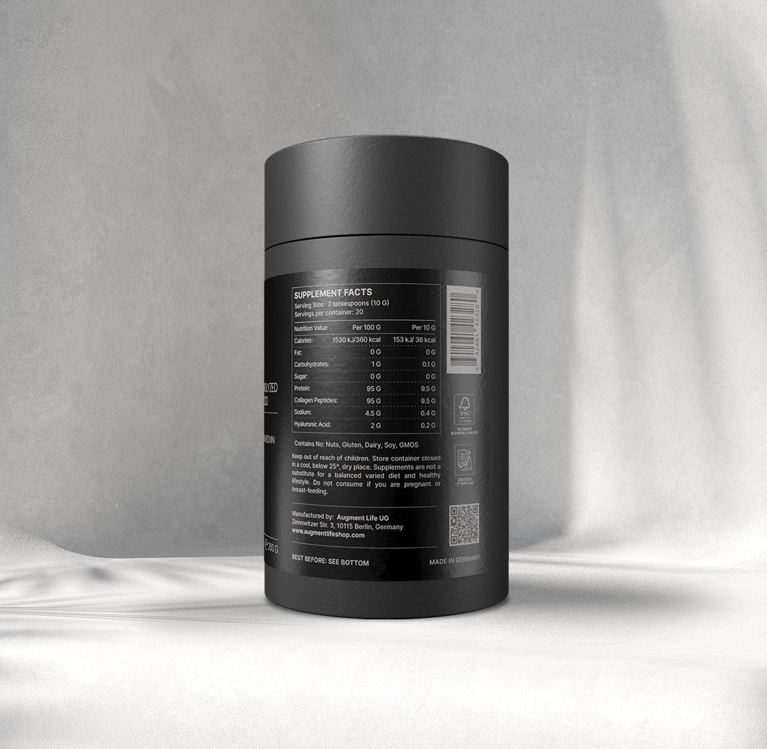 Collagen is an essential protein found in our skin, bones, tendons, and cartilage, where it connects tissues and provides structure. In clinical studies, collagen supplementation has been proven effective in helping the body rebuild tissues and regenerate hair, nails, and skin. It may alleviate conditions of aging and even improve sports performance. Augment Life’s Collagen ensures a high content of easily absorbable protein collagen and essential amino acids required for collagen production. Collagen peptide supplements are safe to consume with almost no side effects. We recommend mixing one tablespoon (5 g) twice daily into your hot or cold liquid meals, such as cereal, soups, or smoothies. It clumps easily, so be sure to stir it thoroughly.