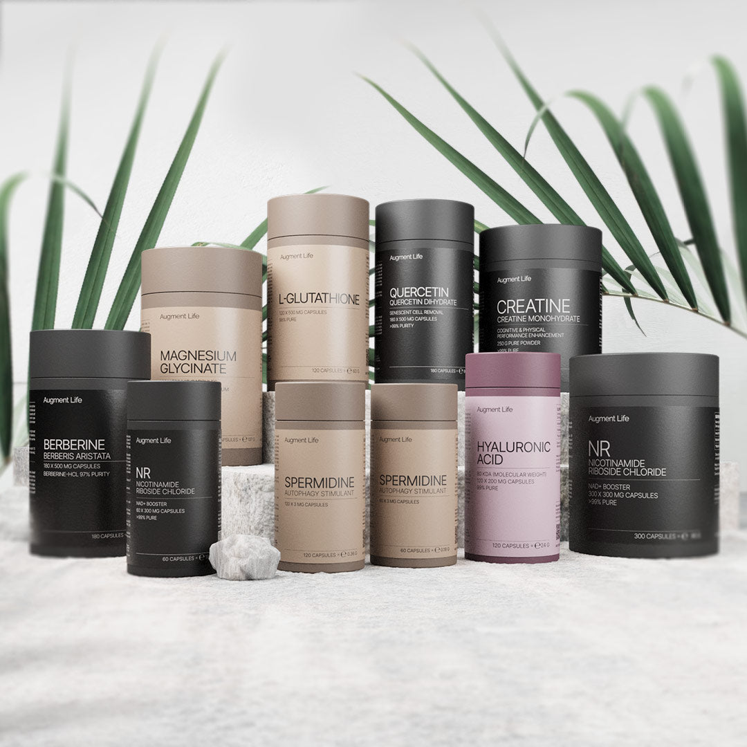 NR, Spermidine, Magnesium Glycinate, Berberine, Quercetin, Creatine Monohydrate, Hyaluronic Acid, and L-Glutathione.