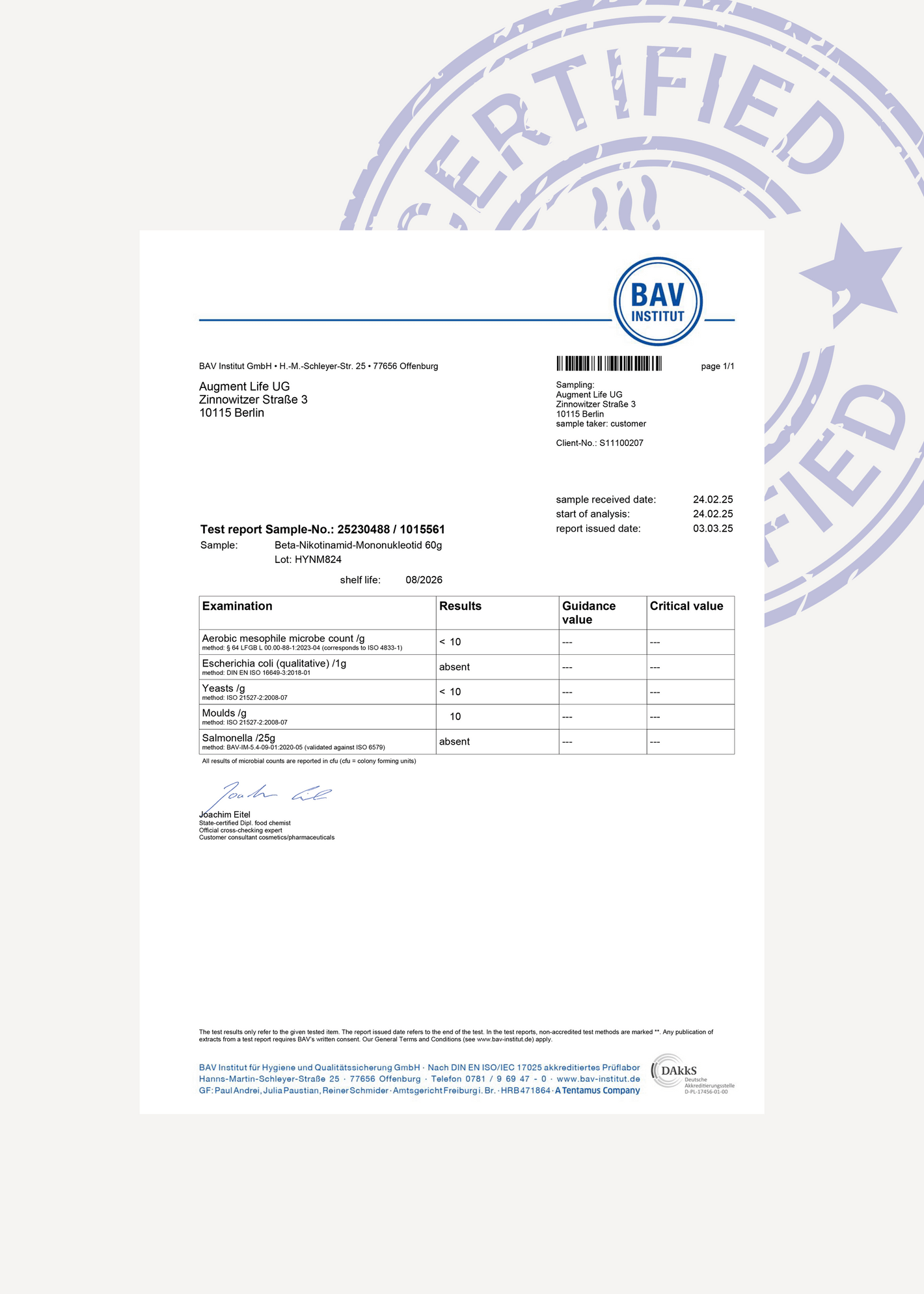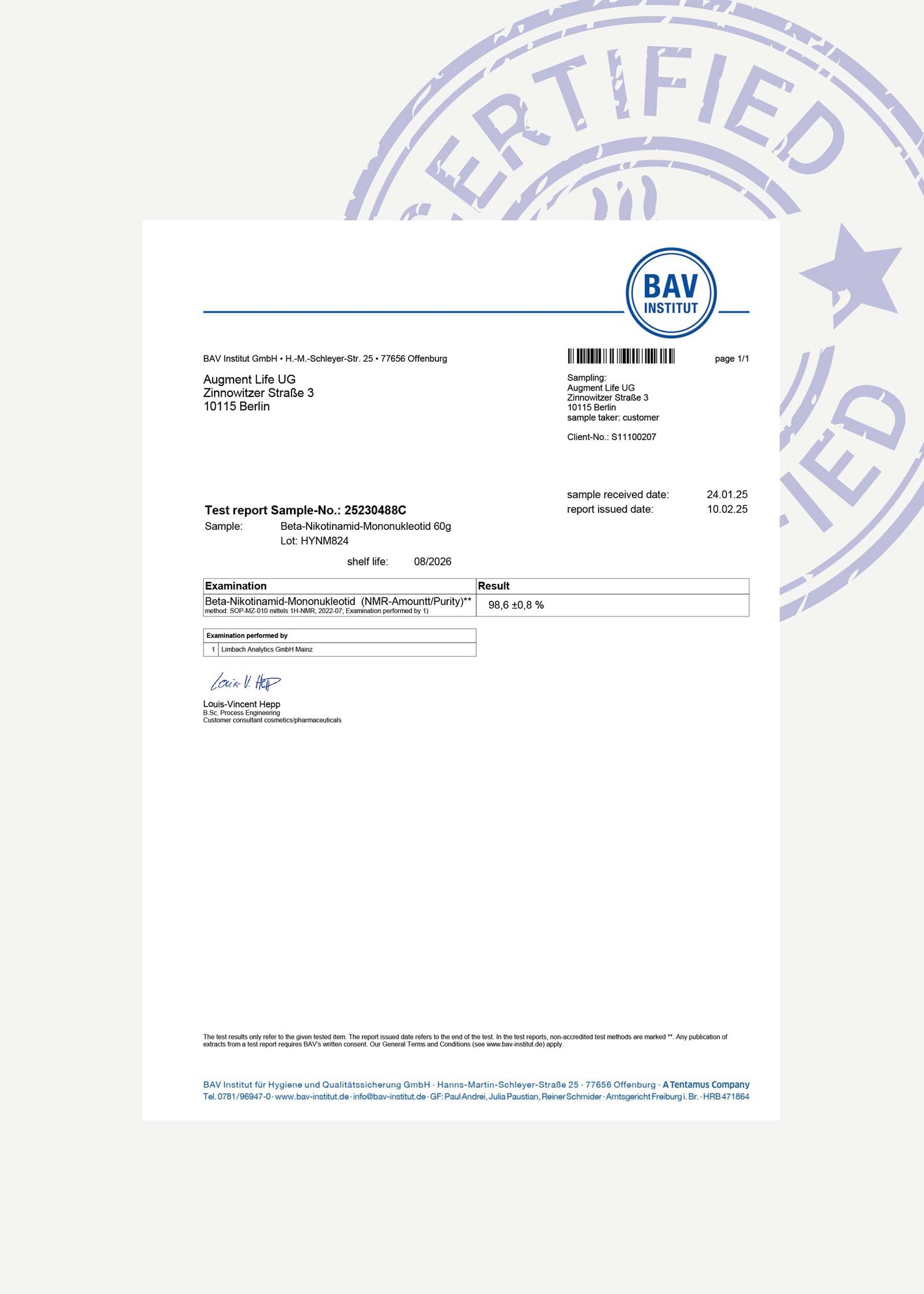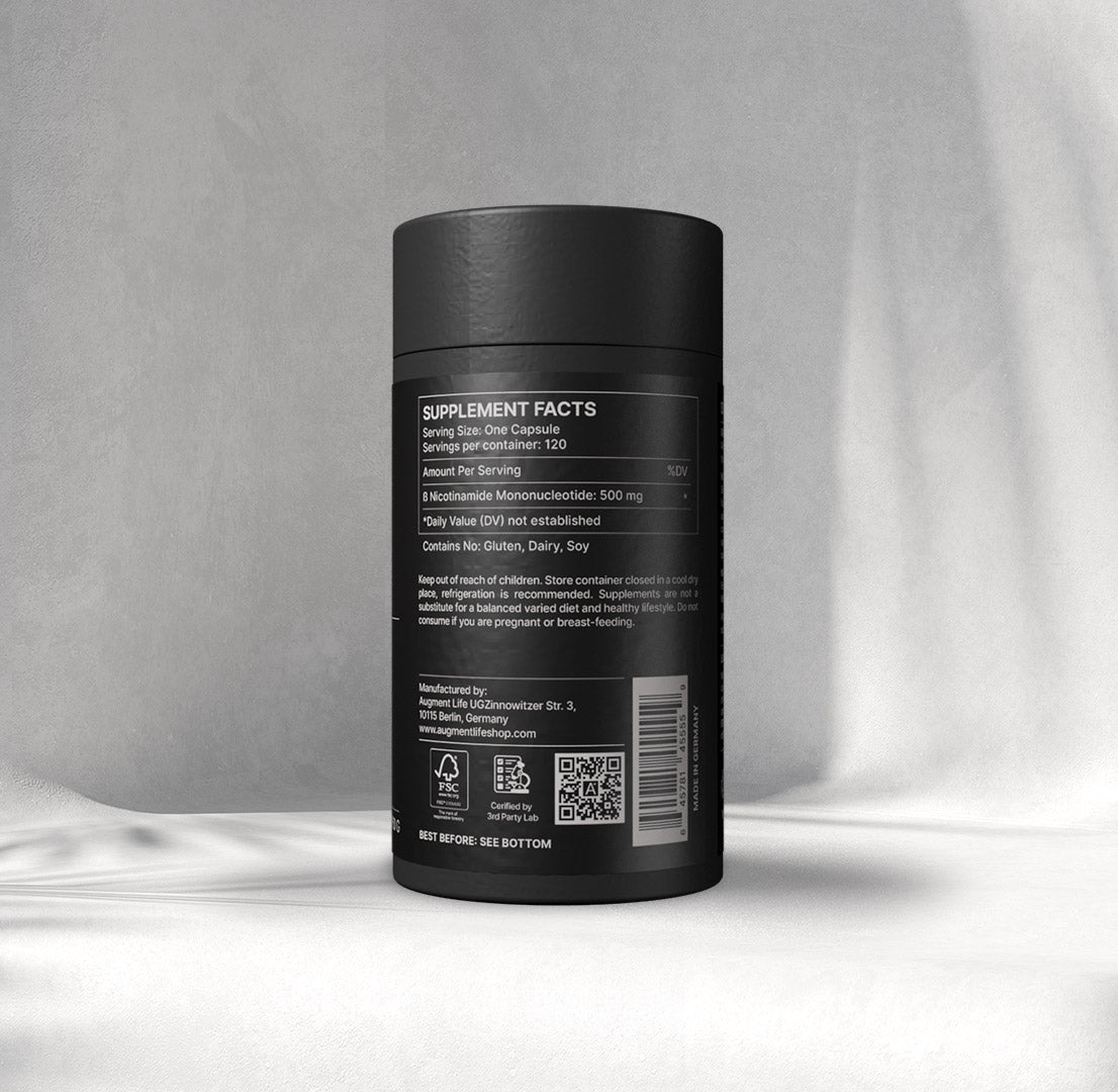 Le NMN est un précurseur du NAD+, une molécule qui joue un rôle dans la modulation du vieillissement cellulaire. Le NAD+ prévient les dommages à l’ADN et est associé à un ralentissement des processus de vieillissement, à une expression génétique correcte, à une amélioration de la fonction musculaire, à une augmentation du niveau d’énergie et à une meilleure action de l’insuline. La supplémentation en NMN a été cliniquement prouvée pour augmenter les niveaux sanguins de NAD+. Notre NMN est formulé avec des ingrédients de la plus haute qualité et testé par un laboratoire indépendant afin de garantir des normes strictes de sécurité et de pureté.