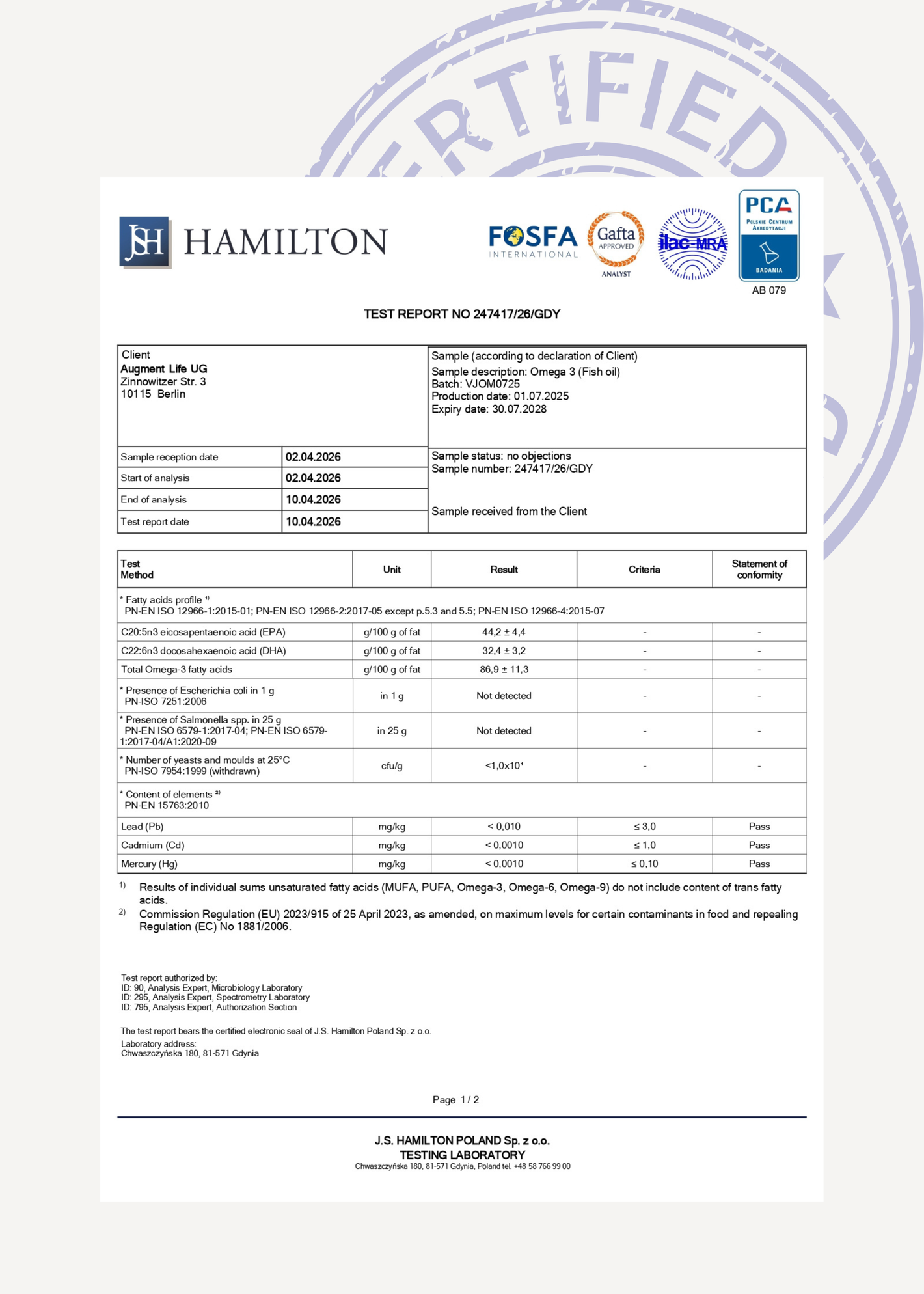 Omega-3-vetzuren helpen daarnaast bij het behouden van normale triglyceridenwaarden en beschikken over natuurlijke ontstekingsremmende eigenschappen die het algehele welzijn ondersteunen. Wij controleren 100% op zware metalen (ZM’s) en hebben ervoor gezorgd dat deze visoliesupplementen geen zware metalen bevatten, met name kwik, dat bekendstaat om zijn aanwezigheid in zeeleven.