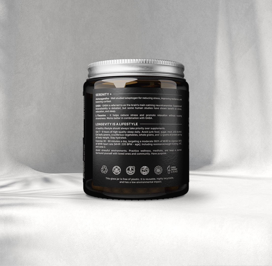 Serenity+ fills an essential gap in our longevity range. It is a calming, restorative formula designed to support relaxation, nervous-system balance, and deeper sleep quality.