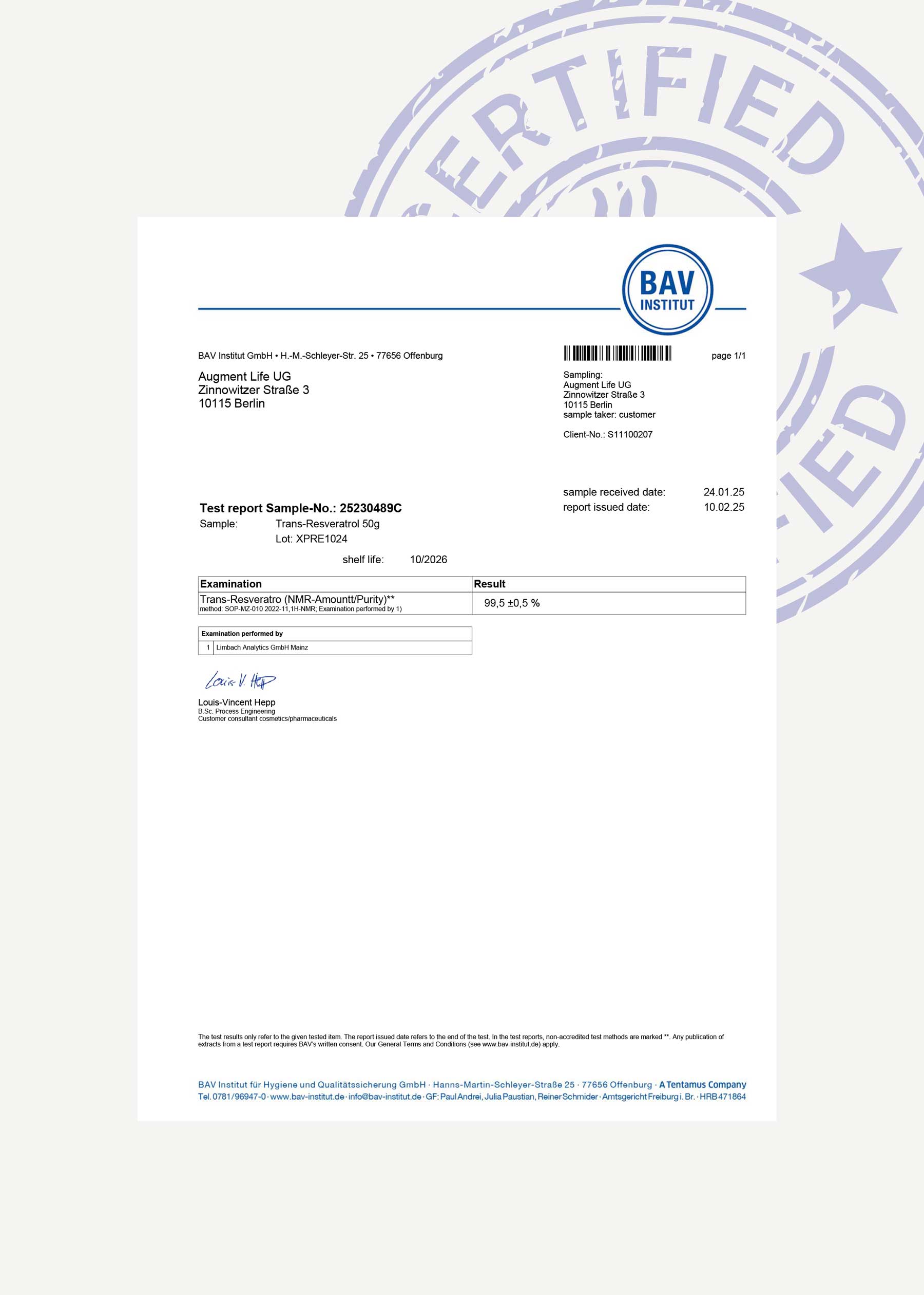 Resveratrol är en växtbaserad polyfenol som förekommer naturligt i druvskal och druvkärnor. Den mest aktiva formen av resveratrol - trans-resveratrol - är känd för att aktivera SIRT1-livslängdsgenen och kan ha...
